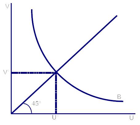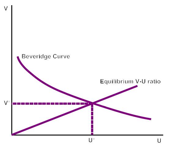 The 45º line represents equal numbers of vacancies and unemployed workers, therefore no excess demand or supply in the aggregate. Its intersection with the B-Curve determines the level of unemployment that should be viewed as “full employment” for any particular economy. This full employment level can be lowered by making the labor market more efficient, through job training programs (to reduce structural unemployment) and information and referral systems (to reduce frictional unemployment).
